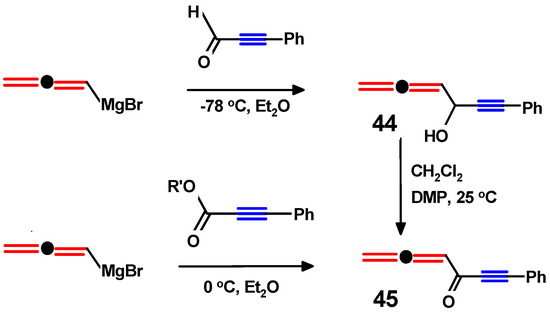 Propargyl–allenols and ketones, such as 44 and 45, respectively, are also preparable via the reaction of an allenyl Grignard reagent with the appropriate alkynal or alkynyl ester, as in Scheme 18 [49].