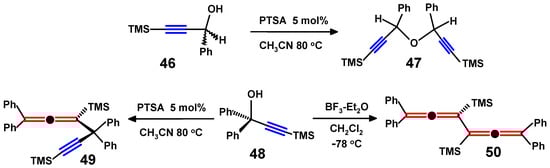 Thus, treatment of 48 with a catalytic quantity of p-toluenesulfonic acid (PTSA) led to 3,6-bis(trimethylsilyl)-1,1,4,4-tetraphenyl-1,2-hexadien-5-yne, 49, which was characterised by X-ray crystallography. In contrast, as shown in Scheme 19, the corresponding reaction with BF3·Et2O led to the diallene 50, the result of a tail-to-tail reductive dimerisation.