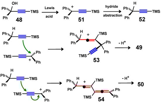 These observations were rationalised by Chauvin (Scheme 20) in terms of the initial production of the pseudo-trityl cation 51, which abstracts a hydride to form 52. Subsequent nucleophilic attack by 52 on 51 can occur either at the cationic site, to generate 53, or at the silylated terminal of the triple bond, thus forming 54; loss of a proton delivers the observed allenyne 49 and the diallene 50, respectively [50].