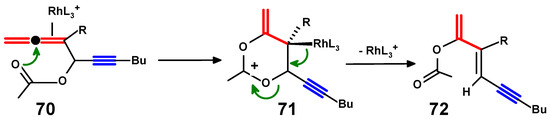 In the alternative scenario, rhodium-catalysed 1,3-acetoxyl rearrangement of propargylallenyl acetates leads to E-diene-dynes [57]. In this case, Rh(I) coordinates initially to the internal double bond of the allenyl fragment in 70, thereby bringing about attack by the carbonyl oxygen of the ester to form the cyclic cation 71; finally, loss of the catalytic rhodium species results in the migration of the acetate and formation of the E-diene-yne, 72 (Scheme 24).