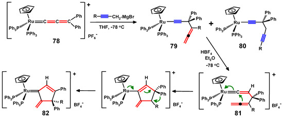 This chemistry was extended by treatment of the ruthenium allenylidene cation 78 with the propargyl Grignard reagents RC≡C-CH2MgBr (R = Me, Et, Ph), which yielded the propargylallenes, 79, as major products (90%), and diynes, 80, as the minor ones. Protonation of the former with HBF4 resulted in cyclisation, via a vinylidene intermediate 81, with subsequent phenyl migration to form the methylene–cyclopentenylidene complexes 82, as shown in Scheme 27.