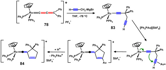 The search for a convenient synthetic route to gem-dialkynylmethane derivatives was finally resolved by Chauvin. This long-sought target was finally obtained via the nucleophilic attack of sodium acetylide on the cationic ruthenium–allenylidene complex 73, thereby forming the diyne 74, bearing the organo-ruthenium moiety (Scheme 26). Protonation of 74 delivered the vinylidene derivative, 75, which, upon heating at reflux in acetonitrile, released diphenyl-dipropargylmethane, 77, along with the cationic ruthenium complex 76 [50].