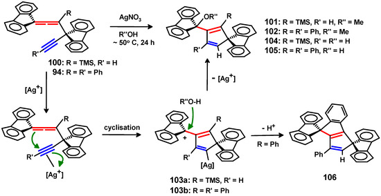 - Oulié, P.; Altes, L.; Milosevic, S.; Bouteille, R.; Müller-Bunz, H.; McGlinchey, M.J. Different reactivity patterns of trimethylsilyl- and phenyl-substituted propargylallenes: Fe2(CO)9 and [Ag]+-promoted cyclizations. Organometallics 2010, 29, 676–686. [Google Scholar] [CrossRef]