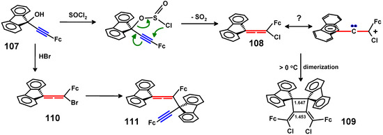 - Banide, E.V.; Ortin, Y.; Chamiot, B.; Cassidy, A.; Niehaus, J.; Moore, A.; Seward, C.M.; Müller-Bunz, H.; McGlinchey, M.J. Syntheses, structures, and dimerizations of ferrocenyl- and fluorenylideneallenes: Push-pull multiple bonds. Organometallics 2008, 27, 4173–4182. [Google Scholar] [CrossRef]