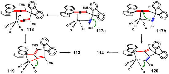 The successful isolation and characterisation of organometallic systems, such as 113 and 115, in which cyclisation has already occurred, but the organometallic moiety is still coordinated, is in accord with established mechanistic proposals for the metal-mediated couplings in 1,n-ene-ynes. In the particular cases 113 and 115, in which the newly formed ring sizes differ, the formation of complexes possessing cyclopentadiene or cyclobutene rings is controlled by the migratory aptitude of the alkynyl substituent in the initial Fe(CO)3 complex, whereby the trimethylsilyl, but not the phenyl, undergoes facile rearrangement to form a vinylidene complex.