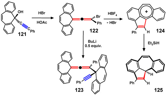 - McGlinchey, M.J.; Hopf, H. Organic and organometallic derivatives of propargylallene: Syntheses, structures, reactivity and rearrangements. Eur. J. Org. Chem. 2013, 2013, 4705–4728. [Google Scholar] [CrossRef]