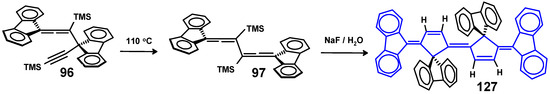 Finally, we note the unexpected result of treating s-trans-1,6-bis((biphenyl-2,2′-diyl)- 3,4-bis(trimethylsilyl)-1,2,4,5-hexatetraene, 97, with potassium fluoride to remove the silyl groups that led instead to the quater-cyclopentadiene, 127, (Scheme 40), whose octacyclic C36 framework represents 60% of C60 and can be mapped directly onto the parent fullerene [65].