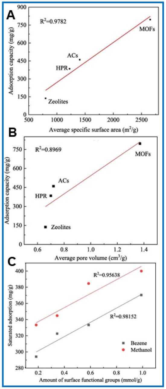 | MOFs | High adsorption capacity, their framework structure is predictable, versatile, and tunable | High cost of organic precursor preparation, poor thermal stability | A variety of VOCs with different molecular weights, polarities, and chemical properties |