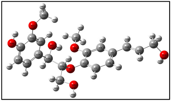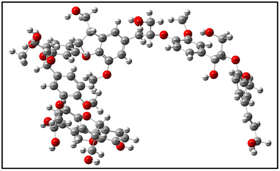 Lignin is the only naturally occurring high molecular weight polymer with an aromatic backbone, making it an exceptional source for the production of chemicals, biofuels, and materials currently obtained from fossil resources. Lignin can be obtained in large quantities from lignocellulosic residues derived from agricultural or forest biomass processing. The molecular formulae of lignin monomers, dimers, trimers, and oligomers [25] designed in this study are shown in Figure 2, Figure 3, Figure 4 and Figure 5, respectively.