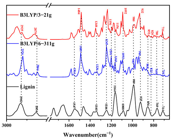 The theoretical infrared spectra were calculated using the optimized molecular model of the lignin trimer, and the comparison with the experimentally measured lignin is shown in Figure 13. Table 3 lists the molecular vibrations corresponding to each of its peak positions in the theoretical spectra of lignin under two different computational basis group conditions. The peak at 2932 cm−1 originates from the C-H telescoping vibration of the methyl group (C37-H72H73H74), where C37-H73H74 is a symmetric telescoping vibration; whereas, the peak at 2854 cm−1 is related to the rocking vibration of C10-H50. The absorption peak near 1547 cm−1, on the other hand, originates from the deformation vibration of the benzene ring B3 and the C-H out-of-plane rocking vibration on the methyl group (C26-H62H63H64); the peak at 1490 cm−1 reflects the rocking vibration of C26-H62H63H64; the absorption peak at 1342 cm−1 is from the C9-H48, C10-H49, and O12-H52 rocking vibrations; the peak at 1246 cm−1 is caused by the breathing vibration of benzene ring B1; the absorption peak at 1201 cm−1 is caused by the combination of the deformation vibration of benzene ring B1 and the rocking vibration of O13-H53; the peak at position 1164 cm−1 contains the outward torsion of the C-H face on the methyl group (C37-H72H73H74), the torsion of C40-H76H77, and the rocking vibration of O35-H71; the peak at 1105 cm−1 corresponds to the deformation vibration of benzene ring B1; the peak at position 1088 cm−1 reflects the deformation of benzene ring B1 and the rocking vibration of O39-H74; the peak at 989 cm−1 originates from the stretching vibration of C36-O37; the peak at position 925 cm−1 is the stretching vibration of O7-H8 with C2-H42 and C17-H54; the absorption peak near 856 cm−1 reflects the deformation of benzene rings B1 and B2; the absorption peak at position 823 cm−1 is caused by the rocking vibrations of C22-H57 and C24-H59H60; and the peak at 714 cm−1 is due to the deformation vibrations of benzene rings B1, B2, and B3.
