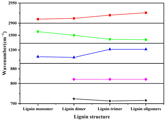 In addition to changes in peak intensity, we can also find that the location of the peaks in the infrared spectra of lignin monomer, lignin dimer, lignin trimer, and lignin oligomer is not exactly the same, as shown in Figure 15. Its peak distribution pattern is shown in Figure 16. For example, at about 2920 cm−1, monomer, dimer, trimer, and oligomer here are corresponding to the infrared absorption peaks and red shift phenomenon, from the point of view of vibrational attribution. The infrared absorption peaks of dimer and trimer here are due to the symmetric stretching vibration of C-H on the methyl group, while the vibrational attribution of the infrared absorption peaks of monomer and oligomer here is due to the anti-symmetric stretching vibration of C-H, and the C and H molecules are not located on the methyl group; near 1500 cm−1, the peak position of the absorption peaks appears to have a blue-shifted phenomenon, as the structure of the lignin becomes simpler. The vibration of the lignin monomer here is caused by the shear rocking vibration of C9-H19H20 and the torsion of C9-H18H19; the peak of the lignin dimer here is caused by the torsion vibration of C9-H32H33; the peak of lignin trimer here is caused by the deformation of the benzene ring B3 and the deformation of the C-H surface on the methyl group (C23-H59H60H61) and the C-H surface on the methyl group (C37-H72H73H74); and the C and H molecules are not located on the methyl group. On the C-H out-of-plane rocking vibration, the peak of lignin oligomer here is due to the O33-H116 rocking vibration and C35-H118H119 shear rocking vibration; while the peak position of the absorption peak at about 1200 cm−1 shows a redshift phenomenon, the lignin monomer here is caused by the torsional vibration of the vibration C12-H23H24; the lignin dimer here peak is caused by the deformation of benzene ring B1 and the rocking vibration of O27-H51 and C23-H46; the peak of lignin trimer here is caused by the deformation of benzene ring B1 and the telescopic vibration of C18-O21; and the peak of lignin oligomer here is due to the deformation of benzene ring B7 and the rocking vibration of O74-H150, which is not a good explanation of the change in the peak position in terms of the vibrational attribution; at 823 cm−1, we can find that, in addition to monomers, oligomers, trimers, and dimers have infrared peaks here; the peaks of oligomers here are due to the deformation of benzene rings B1 and B2; the peaks of trimers here are due to the deformation of benzene ring B3 and the twisting of C40-H77H78; and the peaks of dimers here are due to the deformation of benzene ring B2, which can be analyzed as the reason for the change in peak positions. The functional groups in the molecular structure of dimers, trimers, and oligomers all contain the functional group types in the monomers, but the β-O-4 bond structure is missing in the monomers, so the spectral deviation here may be due to the absence of the β-O-4 structure in the monomers; the absence of peaks in the theoretical infrared spectra of lignin-only monomers at 716 cm−1 also occurs. Combined with the vibrational attribution made earlier, the vibrational attribution of lignin dimers, trimers, and oligomers at this location includes the O-H vibration, and the position of this O-H bond is located in the connection between the two structural units; obviously, the monomer does not exist in this structure, which also explains the reason for the absence of absorption peaks at this location in the monomer.