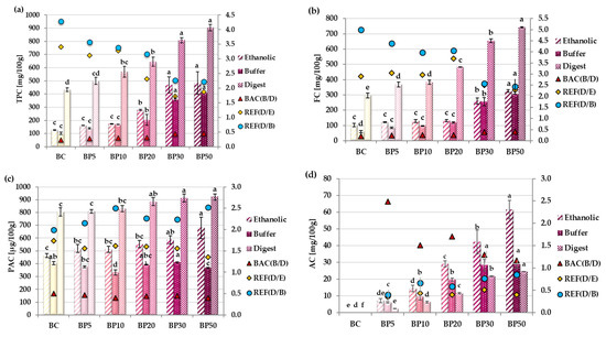 Phenolic compound content in the ethanolic and buffer extract; extract after in vitro digestion of analyzed bars. (a) Total phenolic content; (b) flavonoid content; (c) phenolic acid content; (d) anthocyanin content. BC—control (only apple) bars; BP5–BP50—bars with raspberry pomace addition (from 5 to 50% apple mousse substitution, respectively). REF—relative extractability factor, BAC—bioaccessibility index. All values are mean ± standard deviation for triplicate experiments. Means (±SD) followed by different letters are significantly different (n = 9; p ≤ 0.05) within the same type of extract.