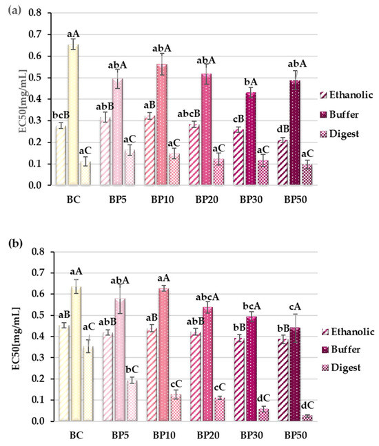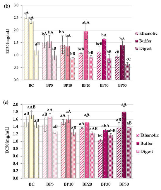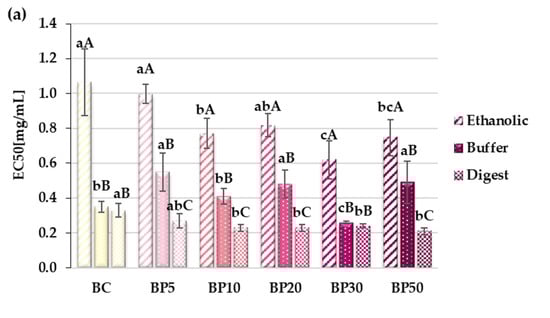 LOX activity was inhibited least effectively by the ethanolic extracts (the highest EC50 values), and most effectively by the digest extracts. EC50 values for extracts obtained after in vitro digestion were similar for bars fortified in the range from BP10 to BP50 and averaged 0.23 mg/mL (Figure 2a).
