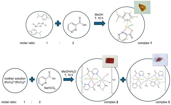 Ruthenium complexes with pyridazine-3-carboxylic acid (pdz-3-COOH) were synthesized using two different sources of metal: a dimeric arene-ruthenium precursor ((η6-p-cym)Ru(μ-Cl)Cl]2) and 0.1 M ruthenium(III) chloride solution (mother solution). The treatment of the arene-ruthenium precursor with ligand in a molar ratio of 1:2 afforded ([(η6-p-cym)RuIICl(pdz-3-COO)] (1) in good yield. The Ru(III) complexes were successfully synthesized using the reflux method (at 65 °C) with the mother solution and a methanol-water solution of the ligand combined with sodium bicarbonate. The addition of NaHCO3 facilitated the deprotonation of the ligand. The Ru(III) ions coordinated with pdz-3-COO− as well as Na+, which participated in the coordination to the same ligands, forming [RuIIICl2(pdz-3-COO)2Na(H2O)]n(H2O)0.11 (2) and [RuIIICl2(pdz-3-COO)2Na(H2O)2]n (3). Details related to the synthetic procedure used are presented in Figure 1. The main product is complex 2. Meanwhile, complex 3 was obtained with a very low yield. Taking into account such low yield, it was not possible to perform biological studies for this complex. Furthermore, the characterization of complex 3 is limited to spectroscopic methods (IR, UV-Vis), electrochemical analysis, and a description of the crystal structure. The composition of the other complexes was established by elemental analysis, spectral methods, magnetic and electrochemical studies, and SC-XRD analysis.