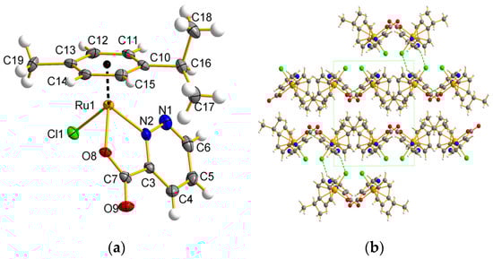 The stability of the [(η6-p-cym)RuIICl(pdz-3-COO)] crystal lattice is further enhanced by C–H⋯Cl and C–H⋯O interactions. Analysis of the packing within the structure of complex 1 indicates that structural units are interconnected through C–H⋯O interactions, forming zig-zag chains (Figure 2b), with the C–H group of the pyridazine ring participating in these interactions. The stability of these chains is reinforced by C–H⋯Cl interactions.