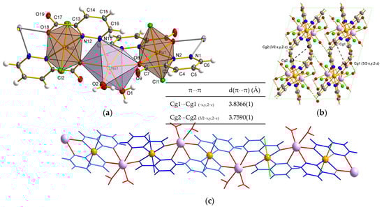The crystal structure of 3 is shown in Figure 4a. The polymeric complex crystallizes into a monoclinic system with the I 2/a space group. The monomeric unit is formed by three metal centers: two ruthenium and one sodium. Each ruthenium(III) ion coordinates with two carboxylates in N,O-chelating manner (by carboxyl oxygen atoms (O8) and two nitrogen atoms (N2) originating from two pzd-3-COO ligands). Coordination sphere is completed with two chloride anions, forming an elongated octahedron. This phenomenon can be attributed to the Jahn-Teller effect. Selected bond lengths and angles are given in Table 3. The axial positions are occupied by two Cl− ions with bond lengths of 2.3402(4) and 2.3285(5) Å (Table 3). The equatorial plane is formed by two trans-related N,O-bidentate pyridazine-3-carboxylate ligands. The Ru–N and Ru–O bonds are nearly symmetrical, similar to those in complex 2, with bond lengths ranging from 2.0311(13) to 2.0388(1) Å. In general, distortion of polyhedron is caused by Ru-Cl bond lengths as well as values of valence angles, of 80 and 92.55°. The same four ligands are engaged in coordination with the sodium ion through N1, N11, O8, and O18 atoms.