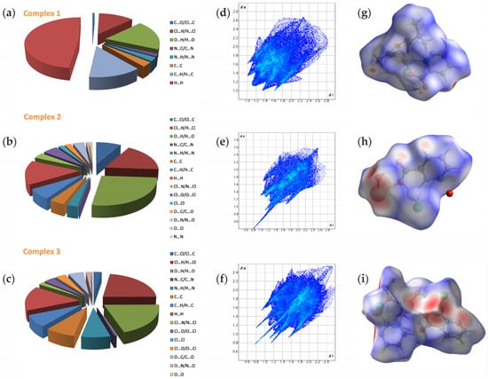To achieve a more thorough understanding of the supramolecular structure of the compounds in question, we present an analysis of the Hirshfeld surface. This methodology serves as an effective tool for exploring both classical and unconventional types of intermolecular interactions. The visualization of the three-dimensional Hirshfeld surface (dnorm) mapped onto the asymmetric unit of the studied compounds is depicted in Figure 5g–i. The intense red regions on the surface, colored according to dnorm, correspond to interactions involving chlorine, nitrogen, and oxygen atoms, which align with the hydrogen bonds detailed in Table S4. In contrast, blue regions indicate longer contacts with a positive dnorm value, while white regions represent distances of contacts that are exactly equal to the van der Waals separation, corresponding to a dnorm value of zero. Figure 5d–f presents the associated fingerprint plots for complexes 1, 2, and 3, revealing the significant contributions of various intermolecular interactions represented on the Hirshfeld surface. The fingerprint plots can be decomposed to emphasize specific atom–pair close contacts.