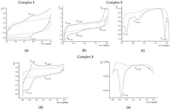 Cyclic voltammetry (CV) and differential pulse voltammetry (DPV) are widely utilized electrochemical techniques that provide both qualitative and quantitative insights into electron transfer mechanisms, the reversibility of electrode processes, and the formal redox potential. The CV curves for complexes 1–3 were recorded on a glassy carbon (GC) electrode within the potential ranges of 0.50 to 1.00 V for complex 1, 1.50 to −0.50 V for complex 2, and 0.6 to −0.6 V for complex 3, referenced against Ag/AgCl. These measurements were conducted at scan rates of 50, 100, 200, and 500 mV s−1. The complexes were dissolved in a mixture of acetonitrile and ethanol (v:v, 3:2) containing 0.1 M tetrabutylammonium hexafluorophosphate (TBAPF6) as the supporting electrolyte. Representative voltammograms are depicted in Figure 6, while Table 4 summarizes the electrochemical data for the complexes analyzed. To assess the reversibility of the redox couples and to determine the number of electrons transferred (n), we applied the CV diagnostic criterion, ΔEp = Epa − Epc (where Epa and Epc represent the anodic and cathodic peak potentials, respectively) applied []. An additional criterion confirming the reversibility of the electrode process and stability of the reaction primary product is the ratio of the reverse and forward peak currents being close to unity. It is noteworthy that the ligand does not exhibit electroactivity under the experimental conditions, as indicated by the dashed line in Figure 6.