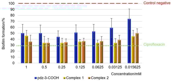 To evaluate the bacteriostatic properties of the ligand and the ruthenium complexes (1 and 2) against Escherichia coli, Staphylococcus aureus, and Pseudomonas aeruginosa, MIC values were determined. In addition to the metal complexes, the MIC of the positive control (ciprofloxacin) and starting materials (metal salt, ruthenium precursor) was also determined. The MIC value was expressed as the lowest concentration to inhibit the visible growth (no turbidity observed) of the test strains following 24 h incubation at 37 °C. The results are summarized in Table S5. The analysis of the results showed that the starting compounds used for the synthesis of metal complexes do not reveal any remarkable influence on the growth of the tested bacteria. In turn, complexes 1 and 2 have antibacterial activity at the highest tested concentration (1 mM) against all three bacteria strains used in the studies. The MIC values in this study are comparable to results for ruthenium complexes with heteroaromatic carboxylic acids reported in our previous paper []. Ciprofloxacin inhibits bacterial growth at concentration lower than 62.5 μg/mL. Although bacteria are single-celled organisms, in natural and clinical settings they occur mainly in biofilms. To assess the ability of the tested complexes to prevent the P. aeruginosa PAO1 biofilm formation, bacterial cells were pre-treated with the ruthenium complexes or ciprofloxacin for 24 h. The biomass of biofilm formed was examined by crystal violet staining assay. The results of the biological activity of the compounds against the P. aeruginosa PAO1 are presented in Figure 7.