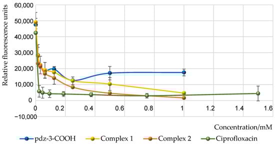 The observed reduction in pyoverdine production clearly evidences that the virulence of the P. aeruginosa PAO1 strain decreases in the presence of the tested compounds. It was found that pdz-3-COOH at the highest concentration tested causes noticeable, albeit the smallest among the studied compounds, reduction in pyoverdine production (by 61%). The ruthenium compounds at a concentration of 1 mM were able to inhibit pyoverdine production by 90% (1) and 96% (2) compared to the negative control (TSB medium with inoculated bacteria). This inhibitory effect of the complexes is comparable to that of the control agent—ciprofloxacin. Importantly, the inhibition of pyoverdine by the complexes is also visible at concentrations of 0.03125 mM, where the fluorescence is reduced by more than 50%. The effectiveness of the compounds is probably due to changes in the iron uptake system and modulation of signaling pathways, resulting in a reduction in the ability of bacteria to survive.