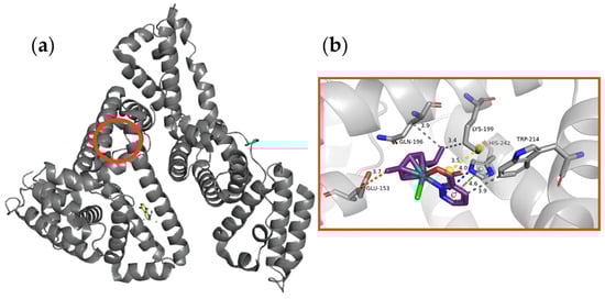 Human serum albumin (HSA) with nitrosyl ruthenium complex (PDB ID 7DL4) and predicted binding pocket (red circle) for the studied ruthenium complex (a). Binding modes for the highest-scored pose of complex 1 (b) with interactions stabilizing the protein–ligand adduct (key amino acids shown as capped sticks).