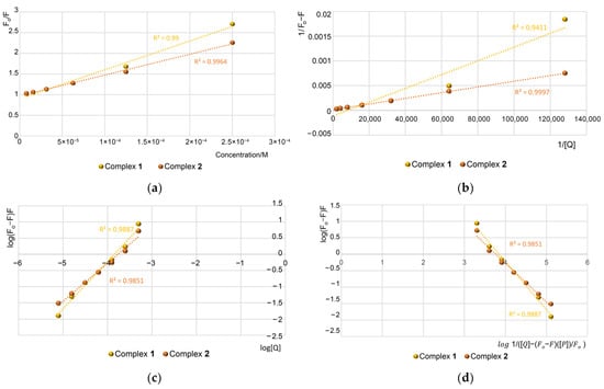 Figure 10a displays the Stern–Volmer plots of the quenching of HSA fluorescence by Ru complexes. As it is seen, the plot of Fo/F for HSA versus [Q] ranging from 7.8 × 10−6 M−1 to 500 × 10−6 M−1 is linear. This may suggest that a single quenching mechanism, either static or dynamic is observed at these concentrations [,].
