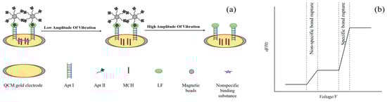 In this study, a 60 MHz gold-plated piezoelectric crystal served as the mass-sensing element. Employing the double-aptamer sandwich approach, aptamer I was anchored to the QCM electrode via the Au-S bonds to capture LF and was paired with the magnetic bead-bound aptamer II to enhance mass detection. The biosensor developed in our laboratory for molecular bond cracking was utilized to adjust the excitation voltage potential applied on quartz. When a low amplitude voltage is applied, it causes the weak bond between the non-specific binding substance and the gold electrode to fracture. Conversely, when a high amplitude voltage is applied, it breaks the strong binding bond between the aptamer II–magnetic bead complex and LF, enabling specific detection of LF. During the bonding process, we obtained the response signal (Δf) related to the surface mass change by measuring the difference frequency signal (df) of QCM. The magnitude of Δf corresponds directly to the mass of detached aptamer II–magnetic bead complex, which is proportional to LF concentration. And the sensor’s detection mechanism is depicted in Figure 1.