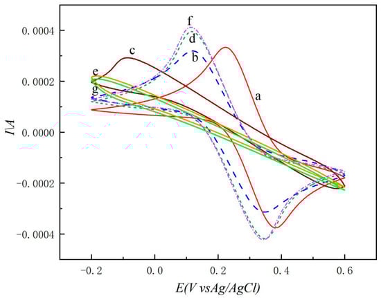 Feasibility test of sensor. Cyclic voltammetry (CV) curves of feasibility test of sensor: (a) QCM Au chip; (b) 3 μmol/L aptamer I; (c) 1 mmol/L MCH; (d) 100 ng/mL LF (30 °C); (e) 1 μmol/L aptamer II-magnetic beads (30 °C); (f) after experiment of bond rupture; (g) 1 μmol/L aptamer II-magnetic beads (after experiment of bond rupture).
