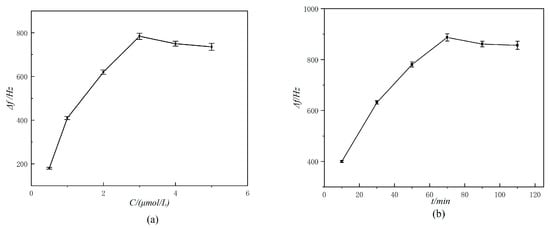 The detection performance of the sensor is significantly influenced by aptamer concentration, reaction time, and the reaction temperature. As shown in Figure 4a, Δf increases with the concentration of the LF aptamer, reaching a peak at 3.0 μmol/L. Therefore, the optimal aptamer concentration was determined to be 3.0 μmol/L. In Figure 4b, the Δf of the sensor initially increases with the total reaction time and stabilizes after 70 min. Thus, the optimal reaction time was set at 70 min. Figure 4c illustrates that as the reaction temperature increases, the binding efficiency of the aptamer to LF also increases, which leads to a higher Δf of the sensor. However, beyond 30 °C, Δf begins to decrease, making 30 °C the optimal reaction temperature.