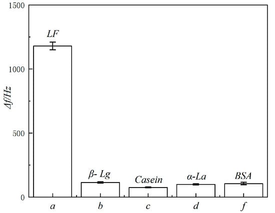 Specificity test of the QCM biosensor: (a) 100 ng/mL LF; (b) 100 ng/mL β-Lg; (c) 100 ng/mL Casein; (d) 100 ng/mL α-La; (f) 100 ng/mL BSA.