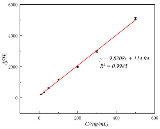 QCM has the advantages of simple structure, low cost, and no labeling for sensor detection. It is widely used as a high-precision quality sensor for the detection of protein molecules []. However, conventional QCM sensing techniques are usually detected in a way that increases the crystal surface mass, resulting in a frequency decrease. Therefore, the flow injection method is generally used []. The detection process usually exists in some interference factors, such as the production of bubbles in the circulation pool and non-specific binding.