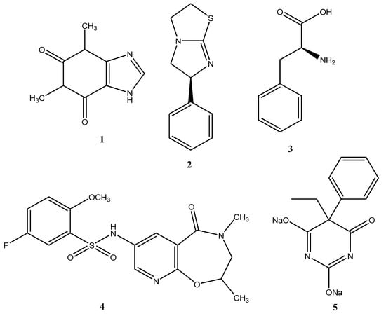 Recently, however, several groups have identified a number of pyrazole, benzo[b]thiophene, 1,2,4-triazole and 1,3,4-thiadiazole, 3,3′-carbonyl-bis(chromones), isonicotinohydrazide, sulfonamide, bisphosphonates, polyphenols, and quinoline derivatives, which are potent and selective inhibitors of ALP isoenzymes [5,9,18]. For example, the first clinical trial of a TNAP-specific inhibitor, DS-1211, a pyrido-oxazinone derivative (4), for the treatment of ectopic calcification has recently been completed [5]. A commonly used anticonvulsant barbiturate, phenobarbital-5-ethyl-5-phenyl-2,4,6(1H,3H,5H)-pyrimidinetrione (5), has been shown to be an effective drug against the ALP target [9] (Figure 1). It is important to note, however, that many of the ALP-specific ligands that have been identified may be involved in undesirable vital pathways, which could result in adverse effects. For example, the common ALP inhibitors, including vanadate, pervanadate, and okadaic acid, have been demonstrated to impact cell viability, functionality, growth, and uptake by inducing alterations in the redox state of mitochondria [20]. Given the lack of clarity surrounding the mechanisms of many pathophysiological conditions associated with increased plasma ALP activity, the study of specific and non-specific ALP binding is a valuable avenue for elucidating the ALP-specific role in metabolic pathways [2,4,13,14,21].