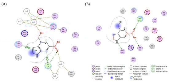 It may, therefore, be proposed that further investigation of both guitarrins C and D as inhibitory regulators of ALP isoenzymes in animals and humans may prove beneficial. Moreover, both bacterial and mammalian alkaline phosphatase (ALP) have been observed to demonstrate the highest affinity for their natural purinergic substrates, particularly adenosine monophosphate (AMP) (Figure 3B) [7,43,44]. The substrate preference of bacterial PhoA enzymes remains uncertain [43,44]. However, the physiological role of mammalian ALP is to reduce the expression of pro-inflammatory signaling metabolites through the hydrolysis of purine nucleotides and the production of anti-inflammatory adenosine [7,8,26,45]. As illustrated in Figure 2, Figure 3, Figure 4 and Figure 5, due to their structural similarity, guitarrin C and D can directly compete with AMP for binding sites in the active site of ALP, thereby causing competitive inhibition of the enzymes and the limiting the process of the formation of the substrate–enzyme complex [27]. Nevertheless, the inhibitory activity of the 5-azoindoles, guitarrin C and D, and the kinetic model for human ALP isoenzymes remain to be determined experimentally in order to ascertain their practical efficacy.