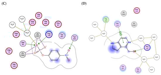 Comparative 2D diagrams of the contacts of guitarrin C (A,B), pNPP (C), and guitarrin B (D) with amino acid residues of the CmAP active site in a water molecule environment (A,C,D) and without H2O in the environment (B). Contact symbols are in (B) (generated in MOE, v. 2020.09).