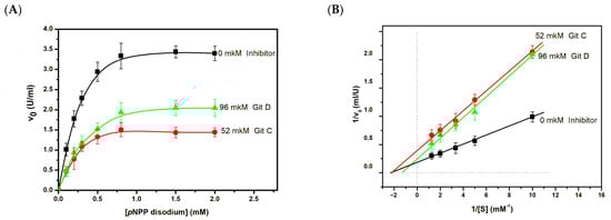 Effect of guitarrin C and D on the Vmax of pNPP (2 mM) catalytic hydrolysis under CmAP (0.003 mg mL−1) (A). The Linweaver–Burk reciprocal analysis (B). The experiments were performed in triplicate.