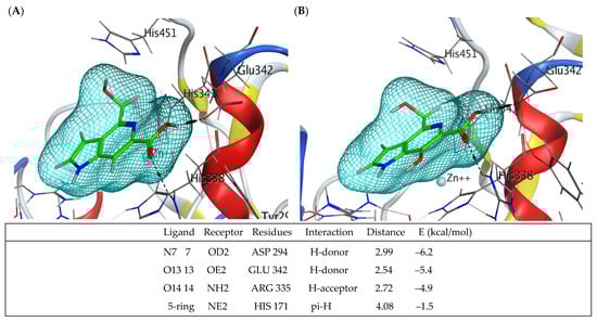 Molecular docking of TNAP alkaline phosphatase with guitarrin C (A) and D (B). The amino acid residues of the active centre (not all fit in the figure) involved in the interaction with the ligand and coordinating zinc ions are signed and shown as sticks. The remaining enzyme residues are shown as ribbons. The molecules of gittarins C and D are shown as sticks (in green). Interactions between the enzyme and the reactive groups (in blue, red and grey) of the ligands are shown as dashed lines. The 3D molecular electrostatic potential contour map of the ligand binding site is shown as a network (in light blue). The modes of ligand–receptor interactions, distance, and calculated binding energy are presented below (generated by MOE, v. 2020.09).