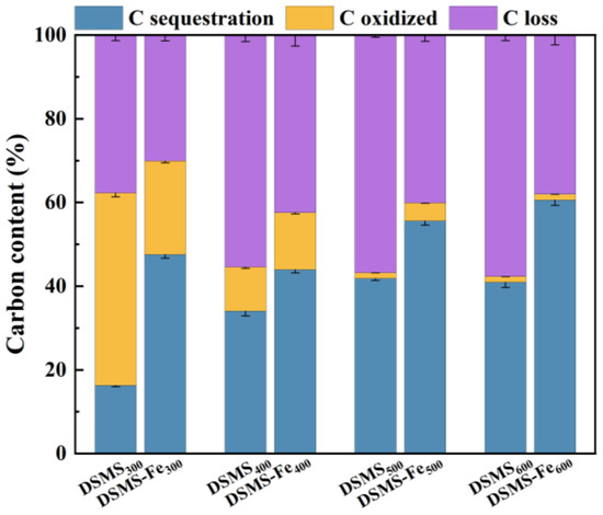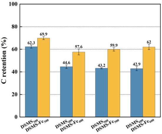 Carbon retention of DSMS and DMSM-Fe under different pyrolysis temperatures.