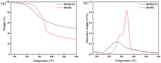 TGA (a) and DTG (b) curves of DSMS and DSMS-Fe combustion.