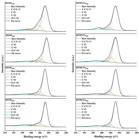 To gain a deeper understanding of the carbon structural characteristics in biochar, this study utilized XPS spectroscopy for semi-quantitative analysis of the composition and content of carbon clusters (Figure 8). The C1s spectra of biochar with and without Fe addition could be deconvoluted into four peaks: C-C/C-C (284.3~284.7 eV) [41,42,43], C-O (286.2~286.8 eV) [44,45], C=O (287.2~287.5 eV) [46,47], and O-C=O (288.8~289.4 eV) [45,47,48]. The corresponding relative percentages of peak areas were listed in Table 3. The results indicated that as the pyrolysis temperature increased from 300 °C to 600 °C, the composition of carbon in biochar primarily shifted towards C-C/C=C groups, with a significant increase in their content. Concurrently, the proportion of carbon groups containing oxygen impurities, such as C-O, decreased markedly, while the proportions of C=O and O-C=O groups increased significantly. This phenomenon suggests that higher pyrolysis temperatures promote the removal of impurity atoms, allowing more carbon atoms to aggregate into pure carbon structural frameworks [49]. These pure carbon structural frameworks exhibit higher stability and antioxidation properties, further validating the enhanced stability of biochar at higher temperatures.