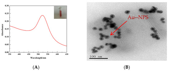 Figure 1. (A) UV–vis spectrum of Au NPs; (B) TEM image of Au NPs.