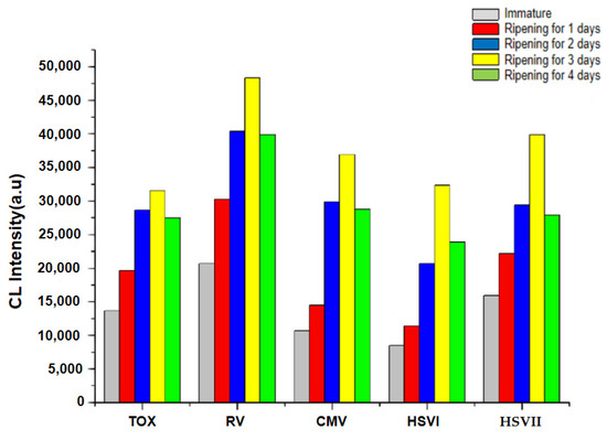 Particle ripening, also known as Ostwald ripening, refers to that when large and small particles exist together in the solution, due to the higher chemical potential of small particles, that is, small nanoparticles have greater solubility, when the monomer concentration in the solution is low, small particles will dissolve, large particles will continue to grow, and the polydispersity of particles will increase [21,22]. The experimental results show that the luminescence values of TOX, RV, CMV, HSVI and HSVII reach the maximum after 3 days of aging of nano gold. Then, with the extension of aging, the luminescence value of the system gradually decreases. Therefore, it is determined that nano gold after 3 days of aging has the best catalytic activity. The reason may be that during the synthesis of gold nanoparticles, as the monomer concentration decreases to a certain extent, some atoms in gold nanoparticles migrate from one part of the particles to another, and this migration process takes a certain time, that is, aging [23,24]. In this study, after 3 days of aging, the gold nanoparticles have been fully formed, and the luminescence value of luminol–H2O2 system is the highest. However, when the aging time is too long, the luminescence value of luminol–H2O2 system is reduced due to its unstable characteristics.
