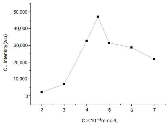 The concentration of gold nanoparticles significantly affects the chemiluminescence enhancement performance of the system. In this study, the optimal concentration level of gold nanoparticles is 4.5 × 10−5 mmol/L. When its concentration is between 2~10 × 10−5 mmol/L When the concentration is between 10−5 mmol/L, the change of concentration level can make the absorbance value fluctuate. When the concentration of gold nanoparticles ≤4.5 × 10−5 mmol/L, the absorbance value is positively correlated with the concentration of gold nanoparticles; If >4.5 × 10−5 mmol/L, due to the interaction between gold nanoparticles and silver particles, the energy generated by chemiluminescence moves back and forth between the particles, resulting in the decrease of absorbance value. With the increasing concentration of gold nanoparticles, the absorbance value will not fluctuate significantly.