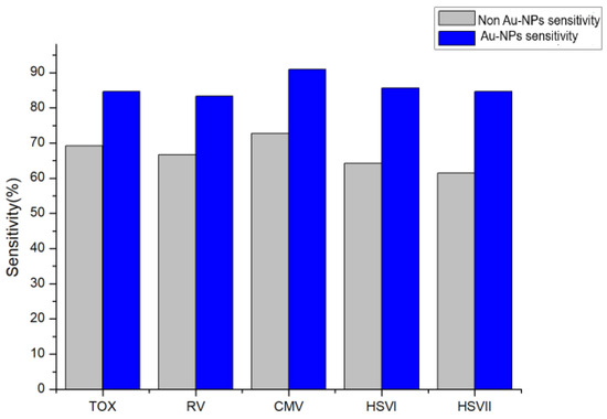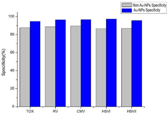 As shown in Figure 4 and Figure 5, the Au-NP/luminol–H2O2 has higher sensitivity and specificity than non-Au-NP/luminol–H2O2 in the detection of TOX, RV, CMV, HSVI, and HSVII antibodies.