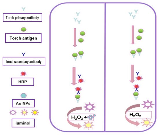 Traditional TORCH detection methods mainly rely on etiology, molecular biology, and immunology. However, these methods are limited in laboratory application because of the cumbersome sample pretreatment and their qualitative not quantitative nature [7]. Chemiluminescence immunoassay (CLIA) technology is a considerable quantitative detection method, which can directly carry out dynamic quantitative detection of specific IgM and IgG antibodies. It has the advantages of high sensitivity, strong specificity, and high reliability. It is a relatively reliable detection method for TORCH infection screening [8]. Luminol has the advantages of easy synthesis, a simple structure, and good water solubility [9,10], Jiang X, Liu J, Favero et al. found that the chemiluminescence (CL) system of luminol–hydrogen peroxide is widely used in the detection of sensitive proteins, hepatitis C virus, and Manson’s schistosome eggs [11,12,13]. However, its detection limit and sensitivity are limited.