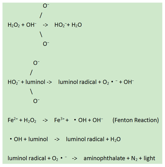 For the detection of TORCH, first, Add 50 μL positive and negative controls to their respective wells, and add 50 μL diluted sample to each corresponding sample well. Then, oscillate for 5 s or more and place in a water bath (37 °C) for 30 min for incubation treatment. Pour out or suction the reaction solution, and after standing for at least 30 s, add washing solution (0.3 mL) for 5 cycles of washing, tap the plate, and add 50 μL of the reaction antigen and 50 μL of the enzyme (Horseradish peroxidase, HRP) conjugate to each hole in turn. After incubating and washing the plate, add the luminol solution, Au-NP solution, and hydrogen peroxide solution, 50 μL each (100 μL in total), vibrate for no less than 5 s, and place it in the dark for 5 ± 0.5 min. Use the MPC-1 microporous plate single photon counter to measure the luminescence intensity of positive control, negative control, and test samples. The process diagram for detecting TORCH antibodies using gold-nanoparticle-enhanced luminol chemiluminescence is shown in Figure 6. Diagram for formation of HO- free radicals in luminol–H2O2 system is shown in Figure 7.