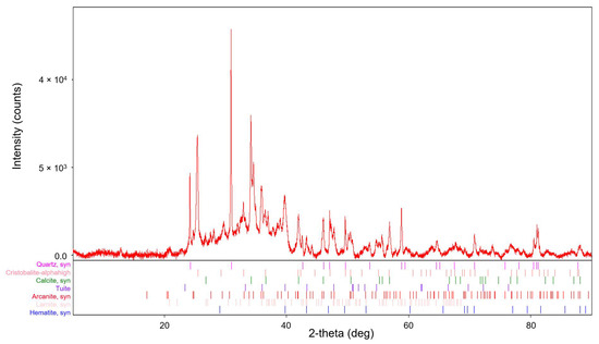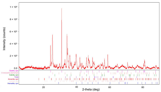Polymorphic minerals containing SiO2 (silica and cristobalite) were present in the bottom ash from the combustion of plant biomass. Cristobalite is essentially a high-temperature form of silica (SiO2). Other typical minerals formed at high temperatures are larnite or haematite. Calcite was also present and is likely to be a product of the combustion of plant biomass containing calcium compounds. Rarer minerals, such as tuite or arcanite, were found here as well. The crystal composition thus confirmed the XRF analysis in terms of its elemental composition.