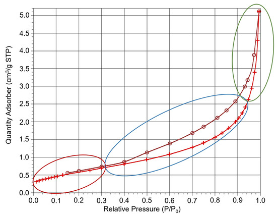 Figure 3. Adsorption and desorption isotherms of bottom ash. Mesopores area—blue ellipse, macropores area—green ellipse, micropores area—red ellipse. Red line with crosses—adsorption curve, dark red line with circles—desorption curve.