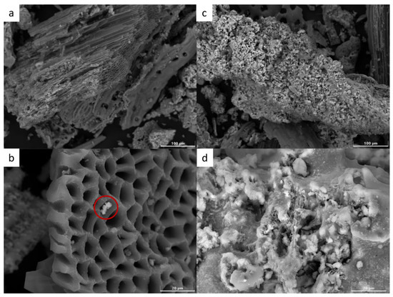 Figure 6. Ash surface morphology. (a) Remains of the plant biomass; (b) zoomed remains of the plant biomass, the red circle indicating the metal in the porous material structure; (c) crystallinity on the surface of the material; (d) zoomed image of crystallinity on the surface of the material.