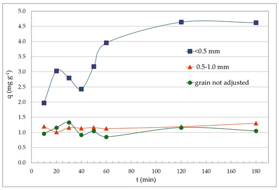 Mass transfer is provided in relation to the particle size, and it may affect adsorption efficiency to some extent. In order to facilitate grain-size sorting and also because particles of smaller size might be poorly wetted by the adsorbate (slower sedimentation properties), the whole fraction < 0.5 mm was used. A vast majority of authors also agree on the higher adsorption capacity when using fine-grained material. In general, smaller particles should be preferred for the adsorption processes, as this will provide a larger active surface area, thus making more binding sites available. This fact is verified by several authors [34,35,36,37]. On the other hand, according to Naja and Volesky (2011), particles with larger spherical shapes may contribute to higher metal adsorption, which they attribute to the contribution of external (surface) diffusion and subsequent mass transport inside the sorbent particles [38]. To remove Cd from the model solution, bottom ash of different grain size fractions was used to study the adsorption kinetics. Based on the results of sieve analysis, it can be concluded that fly ash derived from the combustion of plant biomass predominantly consisted of particles with grain sizes ranging from 0.315 to 0.5 mm (36 wt.%) and 0.180 to 0.315 mm (31 wt.%). In contrast, the fraction exceeding 3.0 mm represented the smallest proportion, accounting for only 1 wt.%, primarily comprising cinder fragments and plant debris. Particles smaller than 0.5 mm, which were utilized in the experiments, constituted approximately 86 wt.% of the sample. The effect of adsorbent particle size on Cd adsorption at different contact times (10, 20, 30, 40, 50, 60, 120 and 180 min) is evaluated graphically in Figure 7.