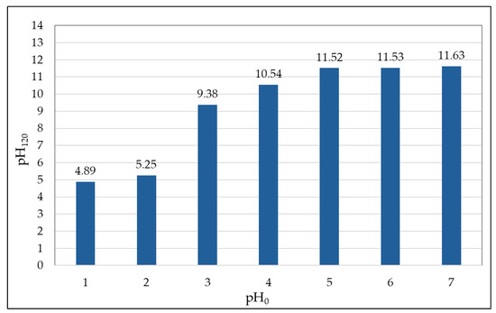 The pH value is of great importance in the study of adsorption and can have a significant effect on the overall course of the removal of metals from the aqueous environment. During the experiments carried out in the kinetics study, it was found that, with respect to the alkaline properties of the adsorbent, mainly in the one with a lower grain-size fraction (<0.5 mm), the pH value increased with increasing contact time between the adsorbent and the adsorbate. Considering its significant influence, it was first verified for the selected bottom ash of a grain-size fraction <0.5 mm how this parameter would vary depending on the contact time (120 min). That is why the model solutions of the tested metal were prepared with different pH values ranging from 1.0–7.0. The pH value was measured at the beginning of the adsorption process (pH0) and also in the filtrate after the end of the adsorption process, i.e., after 120 min (pH120). Graphically, the change in the pH value of the cadmium model solution after 120 min of contact time between the adsorbent and the adsorbate is presented in Figure 8.